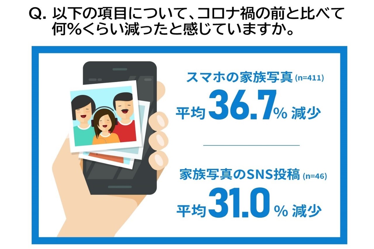 また、平均してスマホの家族写真が約4割、家族写真のSNS投稿が約3割まで減ったと感じているとの結果も出ており、例年と比較しても、写真の減少が家族との思い出が減ったことをより実感させたと考えられます。