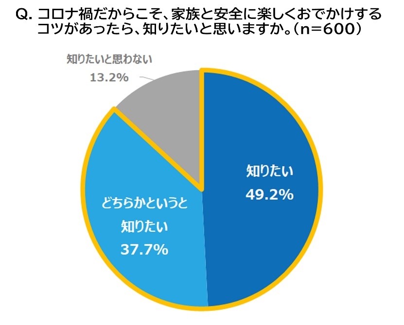 そんな中、約9割近くの親が「コロナ禍だからこそ、家族と安全に楽しくおでかけするコツ」について「知りたい・どちらかというと知りたい」という結果に。こんなにも家族の思い出が減っている中でどうにか工夫をしていきたい想いが伺えます。
