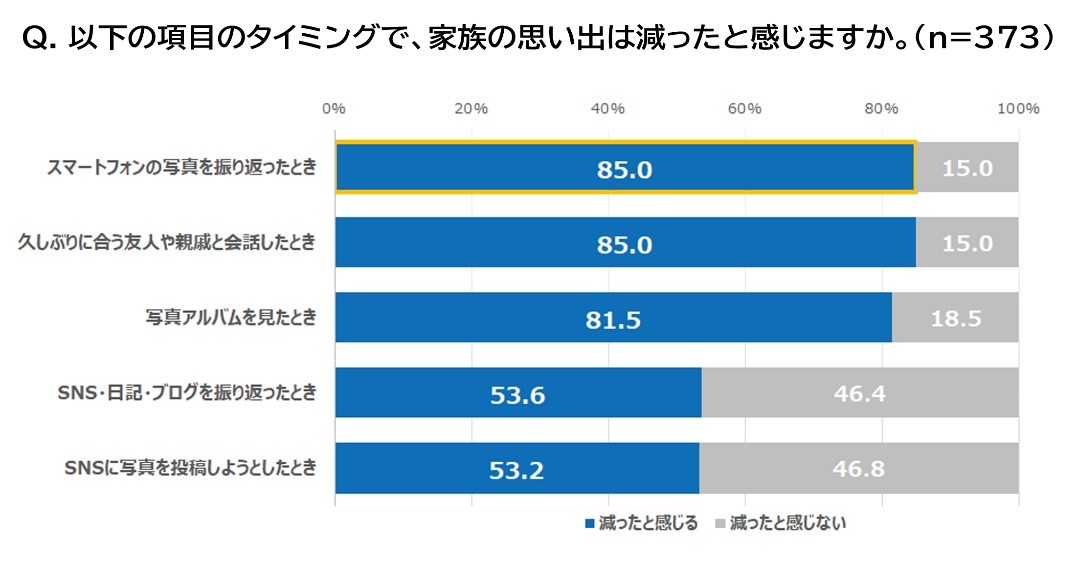 家族との思い出が減ったと感じる瞬間については、「久しぶりに会う友人や親戚と会話したとき」と並んで「スマートフォンの写真を振り返ったとき」が85.0%で最も多い結果となりました。今やスマートフォン1台で写真撮影から加工まであらゆることができる時代。スマートフォンのアルバムやSNSを見返して懐かしくなることもよくありますよね。