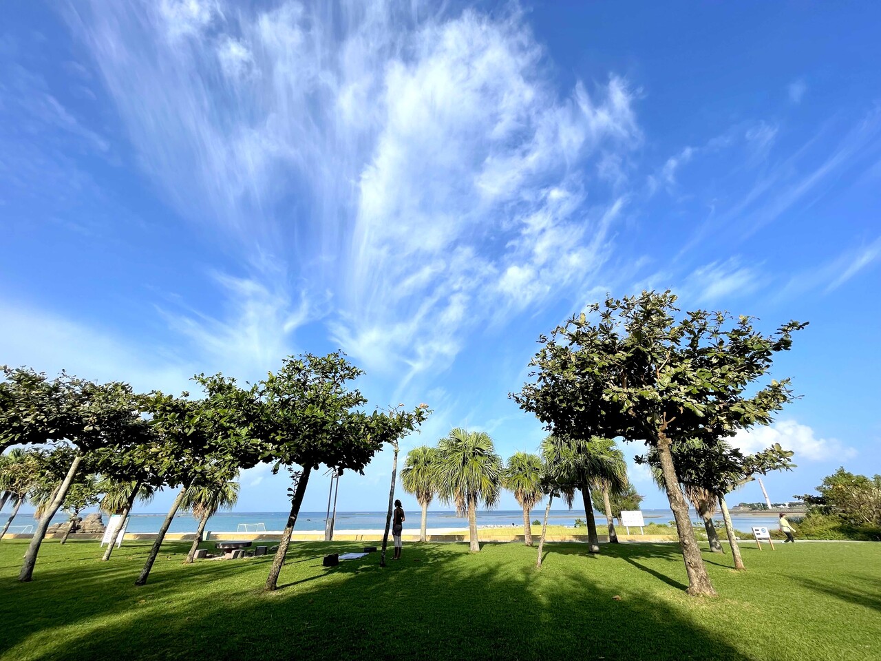 北谷のビーチは夕日がきれいだが、朝もおすすめ。晴れた日は爽やかな青空の中を散策すると、ハワイやカリフォルニアのような雰囲気。朝の早起きな米軍関係者がジョギングをしたり、トレーニングをしたりする姿も。