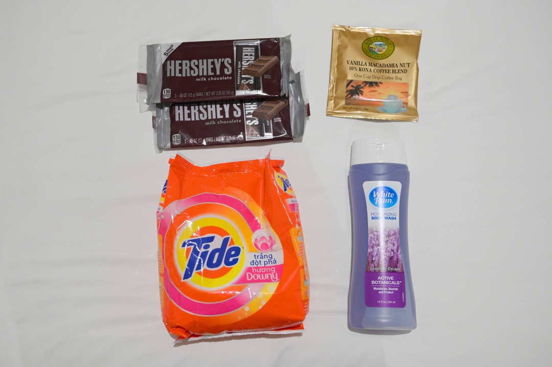 「Jimmy’s」で購入した商品の一部。アメリカのチョコレート「HERSHEY’S」は本州よりも安かったし、ハワイのドリップコーヒーも入手。洗剤やシャンプーなどもあって、香りからしてアメリカらしい。なお、店内は撮影禁止なので注意。