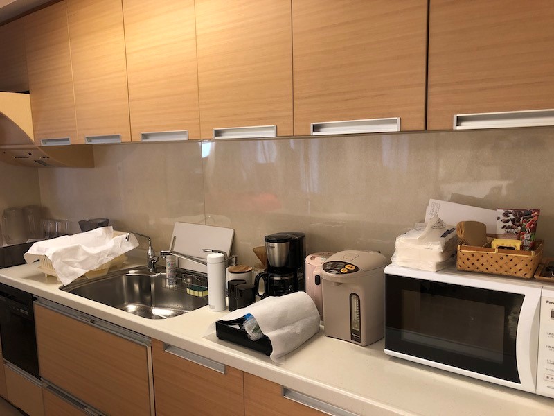 キッチンには電子レンジやコーヒーメーカー、湯沸かしポット、食器類もそろう。もちろんいつでも自由に使うことが可能だ。