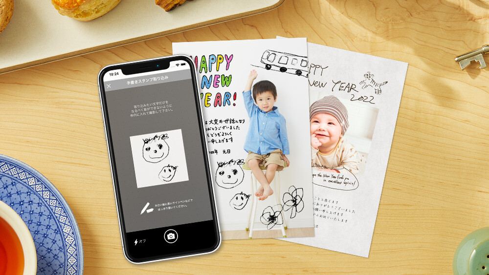”幼いお子様の手書きのメッセージやイラストを年賀状に添えたい”という方におススメの便利な機能です。手書きのメッセージやイラストをアプリで撮影するだけで、簡単にスタンプ化することができるので、手書きメッセージにありがちな誤字やお子様の書き込みによる”はみだし”などの書き損じの心配もありません。