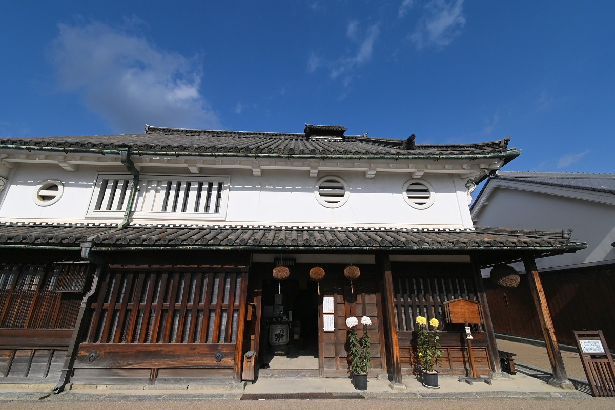 河合酒造の建物も、国の重要文化財。18世紀後半に建てられたという。今井町の中でも存在感がある2階建てで、入口には「お酒の神様」として信仰を集める三輪明神の杉玉が吊るされている。