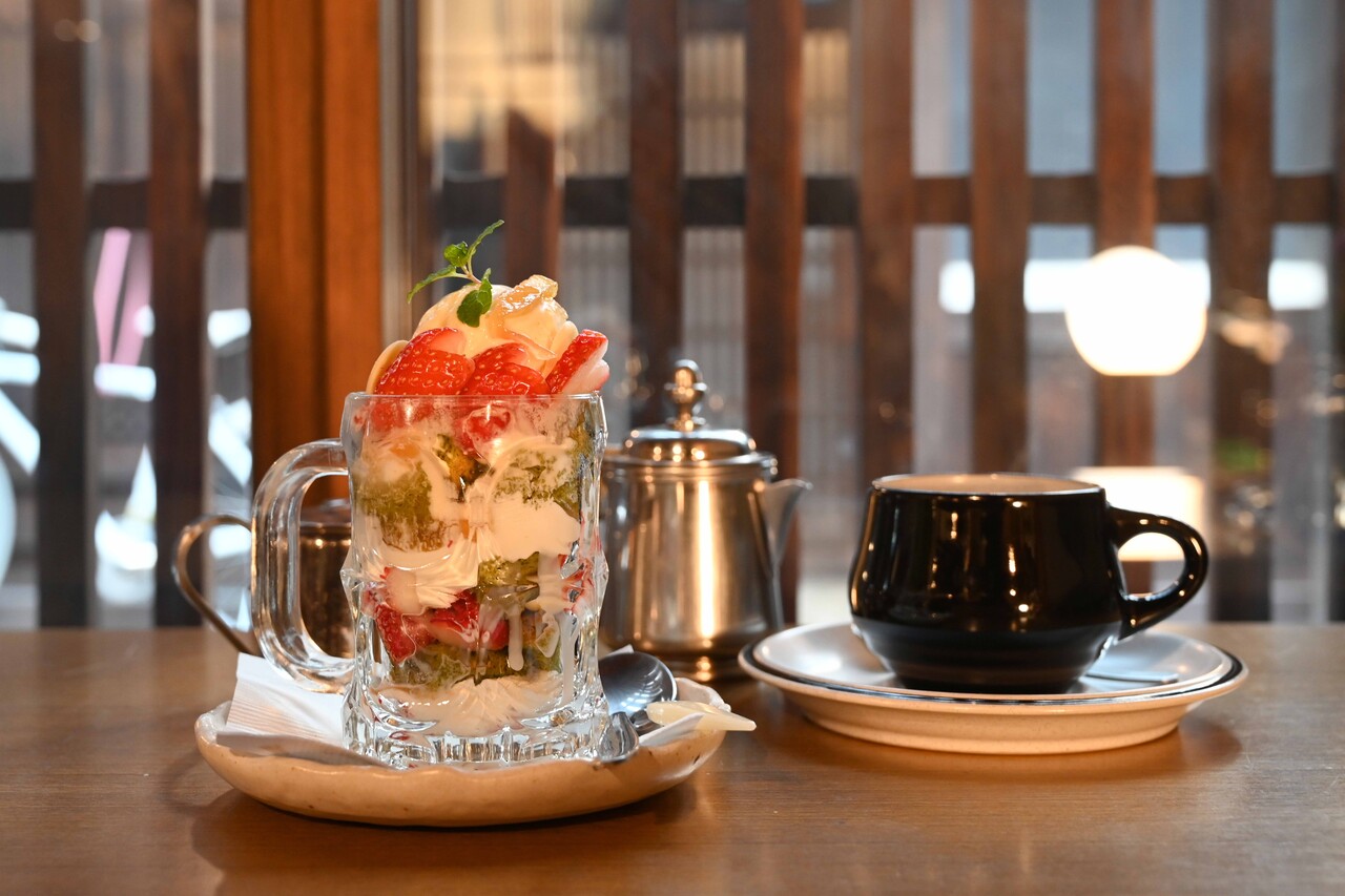 自家製の「本日の気まぐれおやつ」として、この日はいちごとゆず、抹茶米粉のシフォンケーキがジョッキに入ったスイーツをいただいた。ボリューム満点で程よい甘さ、とても美味しかった。