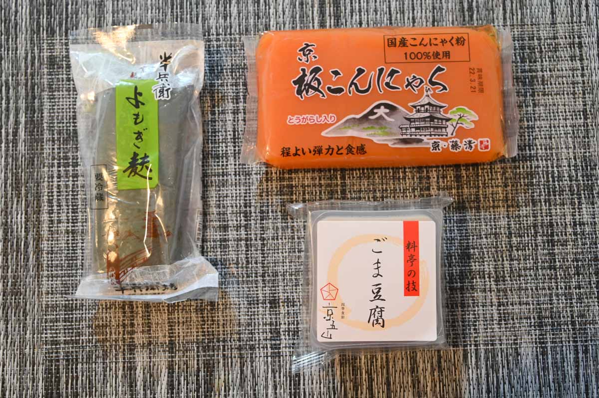 京都と言えば「生麩」「ごま豆腐」「板こんにゃく」など、京都らしい食材も欠かせない。生麩では「半兵衛麩」が有名で、スーパーでも入手できる。期限が近い商品だと割引であることも。
