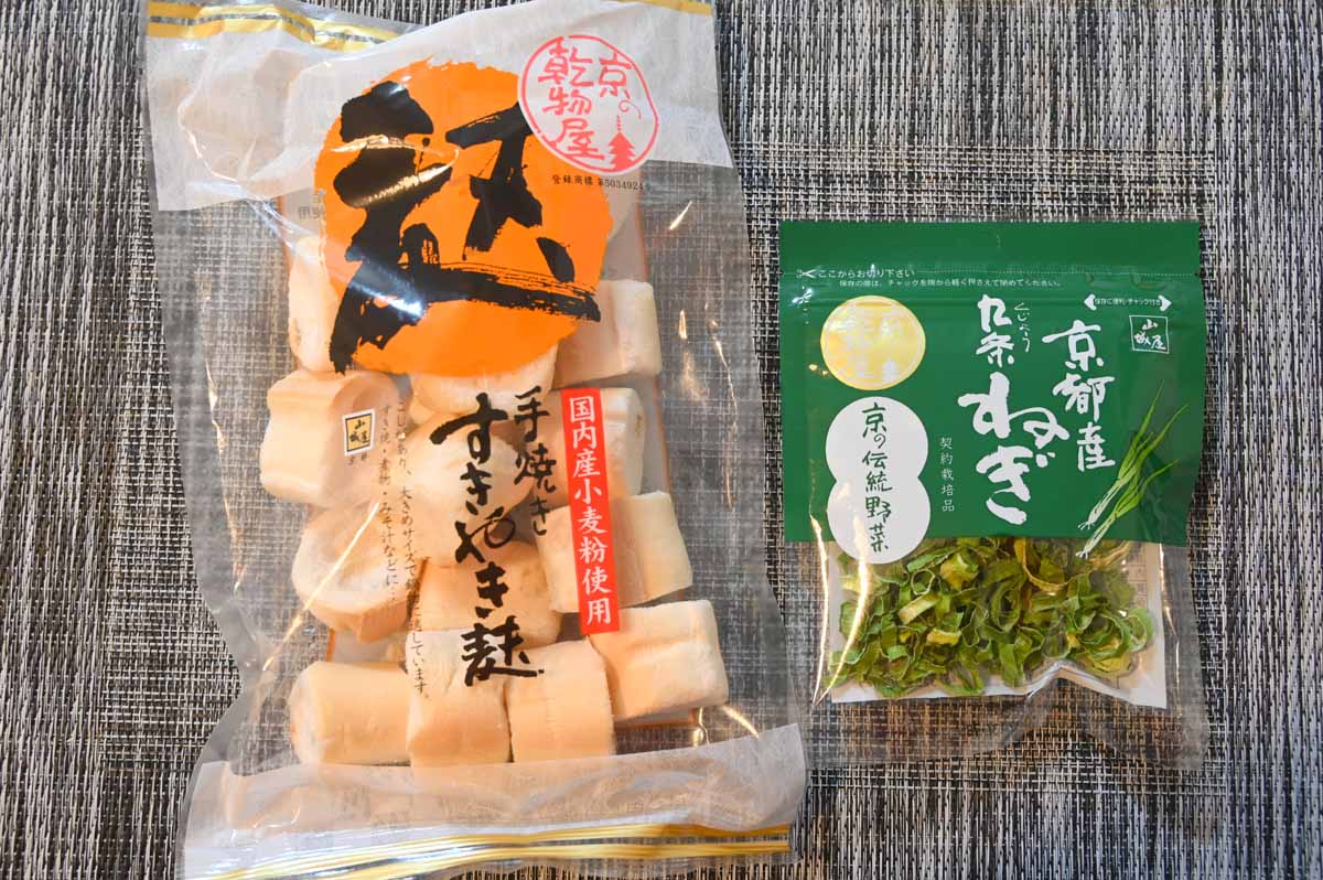 通常の「麩」「乾燥ねぎ」だと、常温保存なので持ち帰るのが簡単で、ちょっと荷物がかさばるものの、なにより軽い。京都と言えば「九条ねぎ」がご当地野菜であり、この乾燥ねぎはマスト。