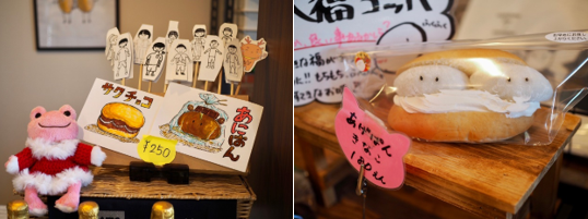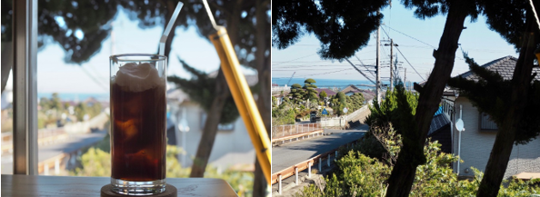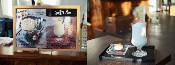 左の和カフェは古民家のリビングみたいな雰囲気で大きな窓からは