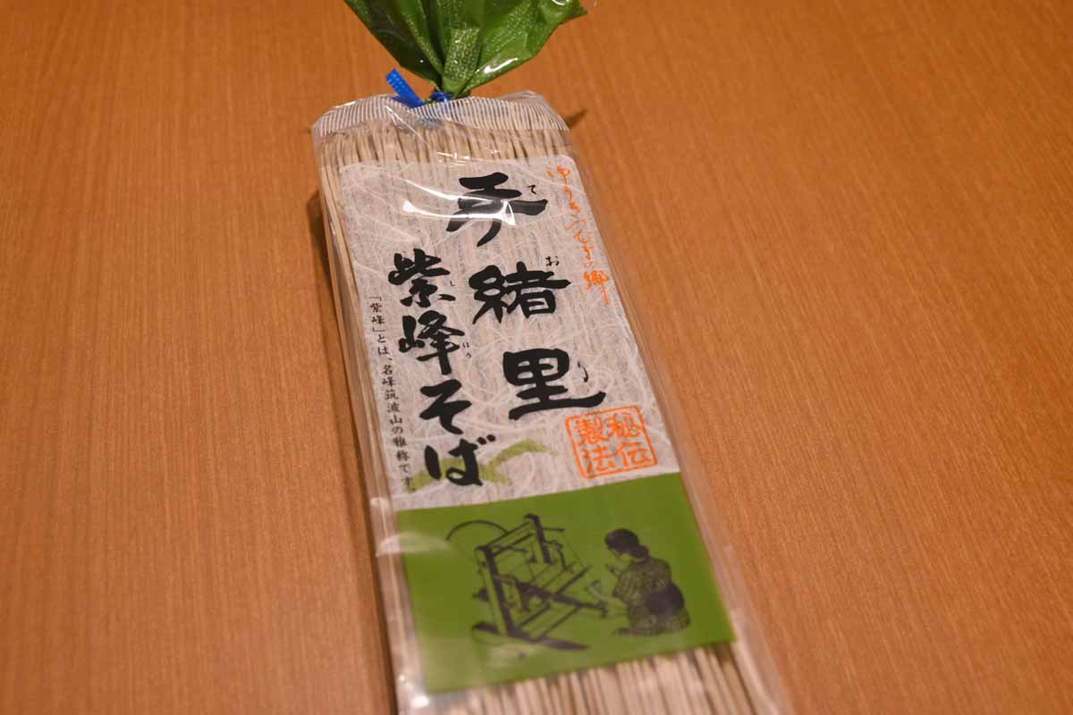 茨城県産の常陸秋そば粉を2割配合し、風味や触感も豊か。紫峰とは、明峰・筑波山の雅称。手緒里めんは「つむぎの里」で知られる結城エリアで、まるでつむぎを織るように丹精込めて作られているとのこと。