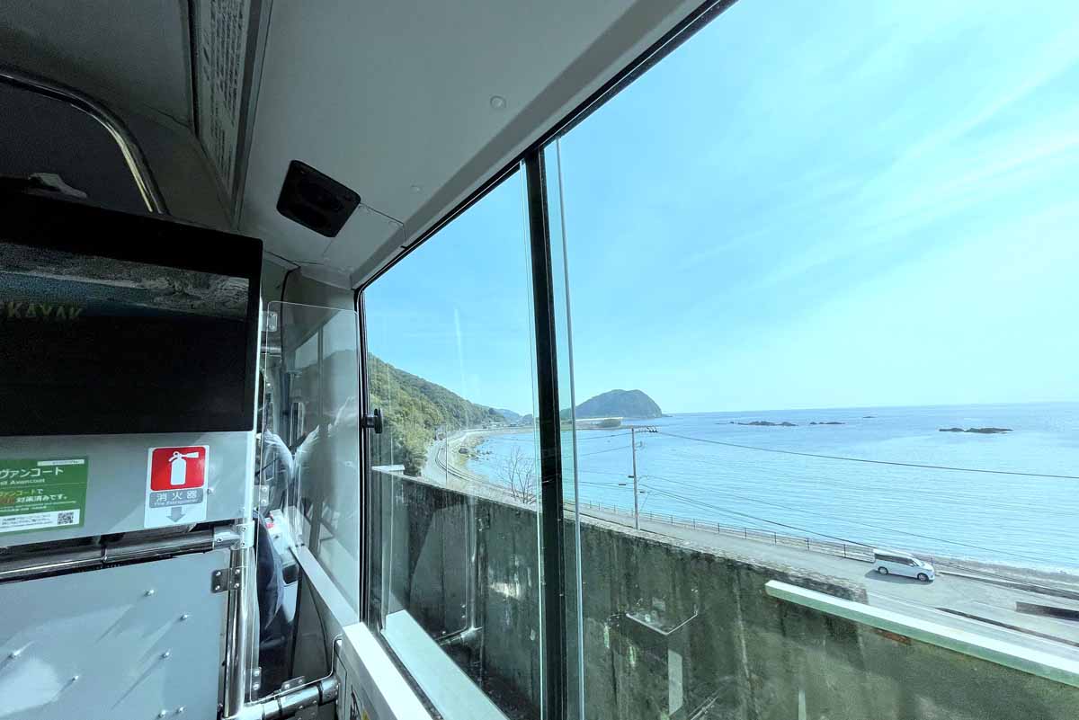 停留所がサーフボード型なのは、路線沿いが太平洋に面したマリンスポーツが盛んな町であることから。事前予約がおすすめですが、当日空席があればその場で運賃を支払って乗ることもできる。バスは時速60kmで走り、約10kmの線路区間で19ものトンネルをくぐり抜け、途中で車窓から美しい那佐湾が見える場所も。線路を走る時のトコトコとした感覚の乗り心地は、一度ぜひ体験してみてほしい。