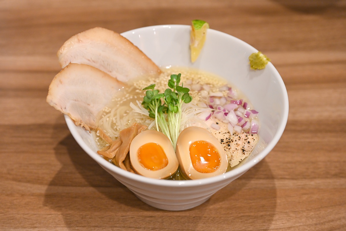 看板メニューである鯛塩ラーメンは、黄金色の透き通ったスープが特徴で、麺や具材にもこだわる。特に、トッピングの味玉に、伊勢神宮にも奉納されている「阿波手摘みたまご」を使い、トロトロの黄味がラーメンと絶妙にマッチする。