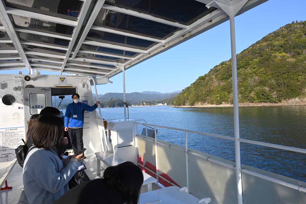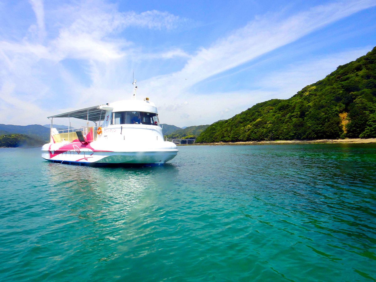 「海中観光船ブルーマリン」は、竹ヶ島を約40分で一巡するコース。「海洋自然博物館 マリンジャム」で受付した後、船に乗り込んで出発する。海風に吹かれながら島の景色をまずは楽しみつつ、同乗するガイドの解説を聞き、いざ船底の観覧スペースへ。