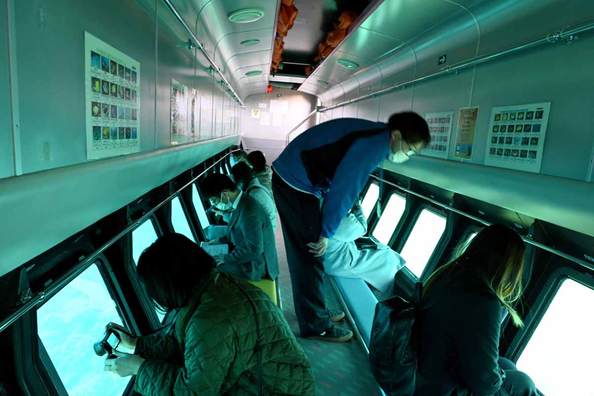 船底では、着席しながら、観覧窓から海中の様子を眺めることができる。特に、この海域で見られる「エダミドリイシ」の高被度群集は見事で、約200年生き続けるサンゴは日本最大級の規模と言われる。