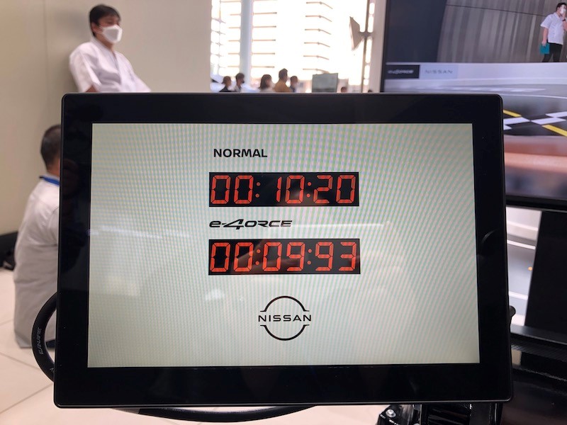 筆者が体験したところ、「e-4ORCE」制御無しではコース完走に10.2秒、制御有りでは9.9秒という結果になった。僅差ではあるものの、制御効果によってより速く走行できることが一目瞭然だ。