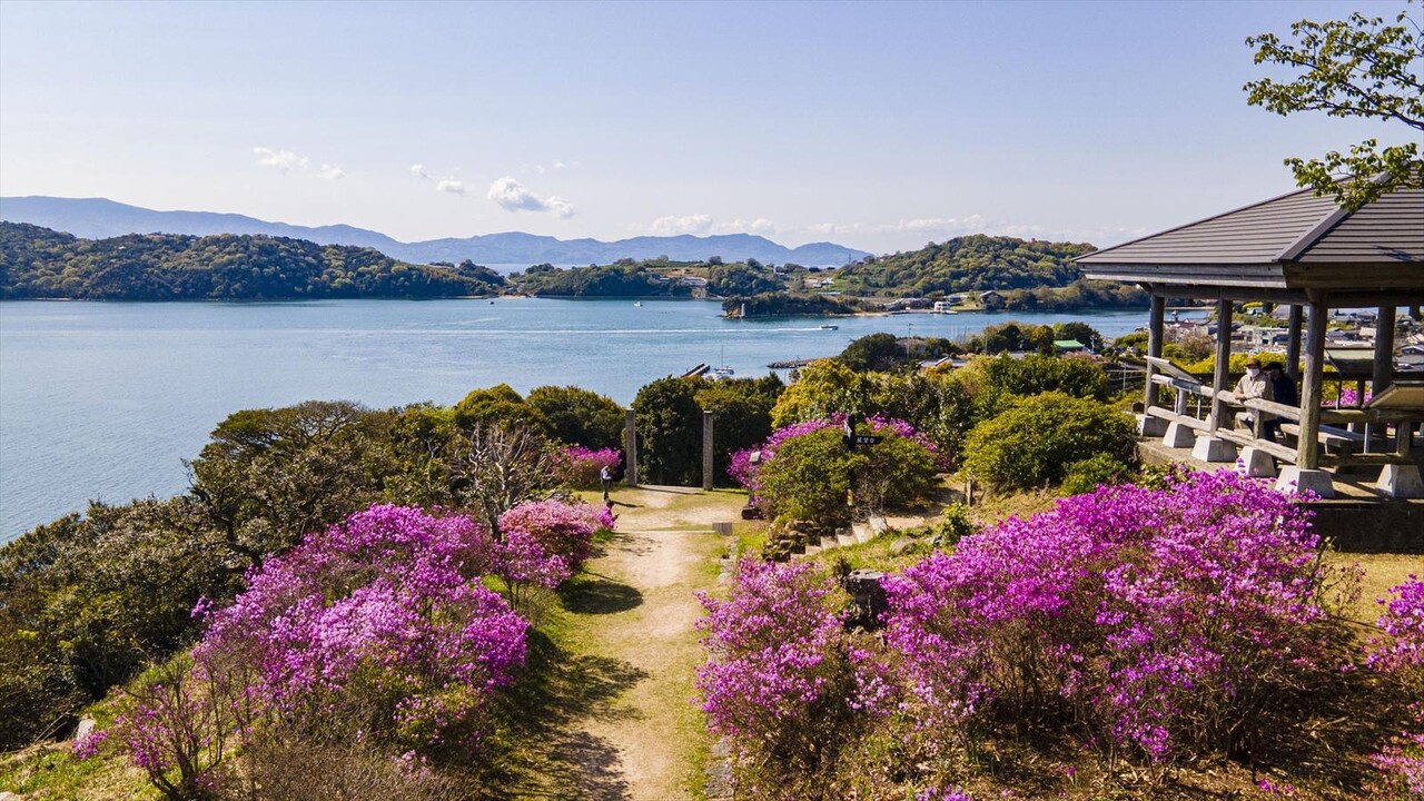 牛窓海水浴場から、上がる長い階段の参道。その中腹にある「望洋亭」周辺はツツジに囲まれる花の参道。春の紫に染まる道は桜とは一味違う雰囲気に包まれます。桜とツツジが同じ頃に咲いているのでピンクと紫のカラーを楽しむことができます。