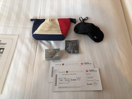 航空機ファンの心をくすぐるのが、JAL国際線で提供されているアメニティ。JALのイメージカラーを採用したポーチには、ティッシュや耳栓、アイマスクが入っている。さらに搭乗券をモチーフとしたオリジナルの宿泊証明書も用意。一見、普通の搭乗券と見間違えてしまいそうな本格的なデザインに脱帽だ。