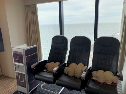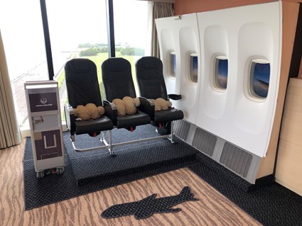 「ウイングルーム」は同ホテルの1008号室。10階の太平洋を臨む角部屋だ。ドアを抜け、目に飛び込んでくるのは、航空機でお馴染みのシートや機内窓、ミールカートなど。思わず感嘆の声が漏れてしまいそうな斬新な空間だ。
