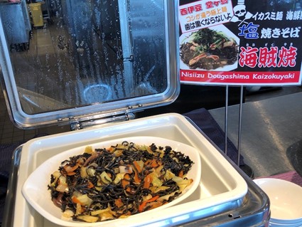 西伊豆の名物料理「海賊焼」も。イカの墨を練り込んだ麺は独特の旨味が特徴。野菜もたっぷり使われており身体が喜ぶ味わいだ。