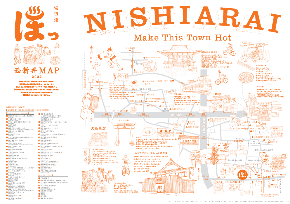 地域をつなぐために、堀田湯では西新井周辺のおすすめスポットやお店を紹介する、魅力がぎっしり詰まったマップを無料で設置している。マップは、オレンジ色を基調とし、手書き風のイラストなどでデザインされていて、ほっ、と温かい印象を受ける。