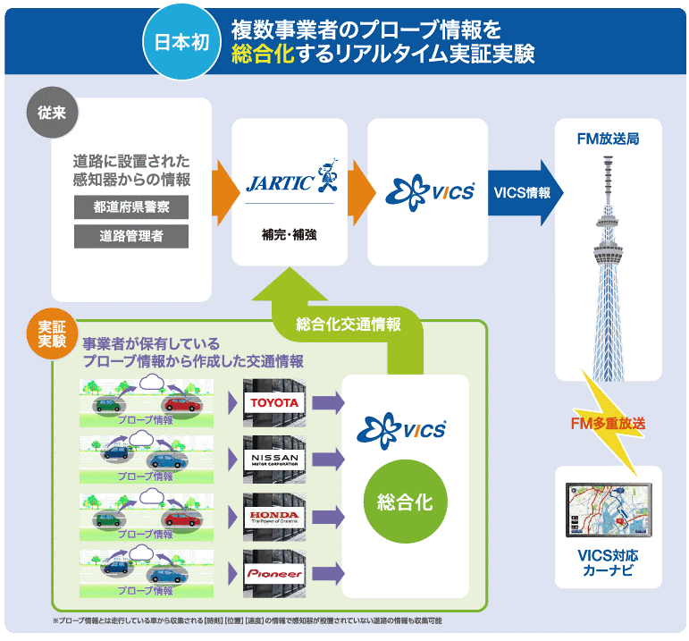 従来の交通情報は、道路に設置された感知機から収集した情報を元に作られています。その感知機を元にした情報に「プローブ情報」をプラスし、データを束ねて解析後、さらに正確な道路交通情報を提供していく、という取り組みが「プローブ情報活用サービス実証実験」です。
