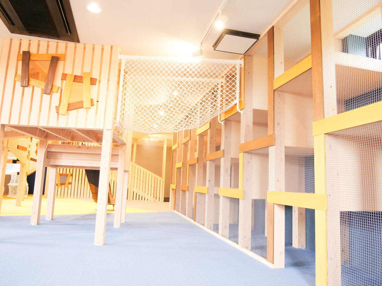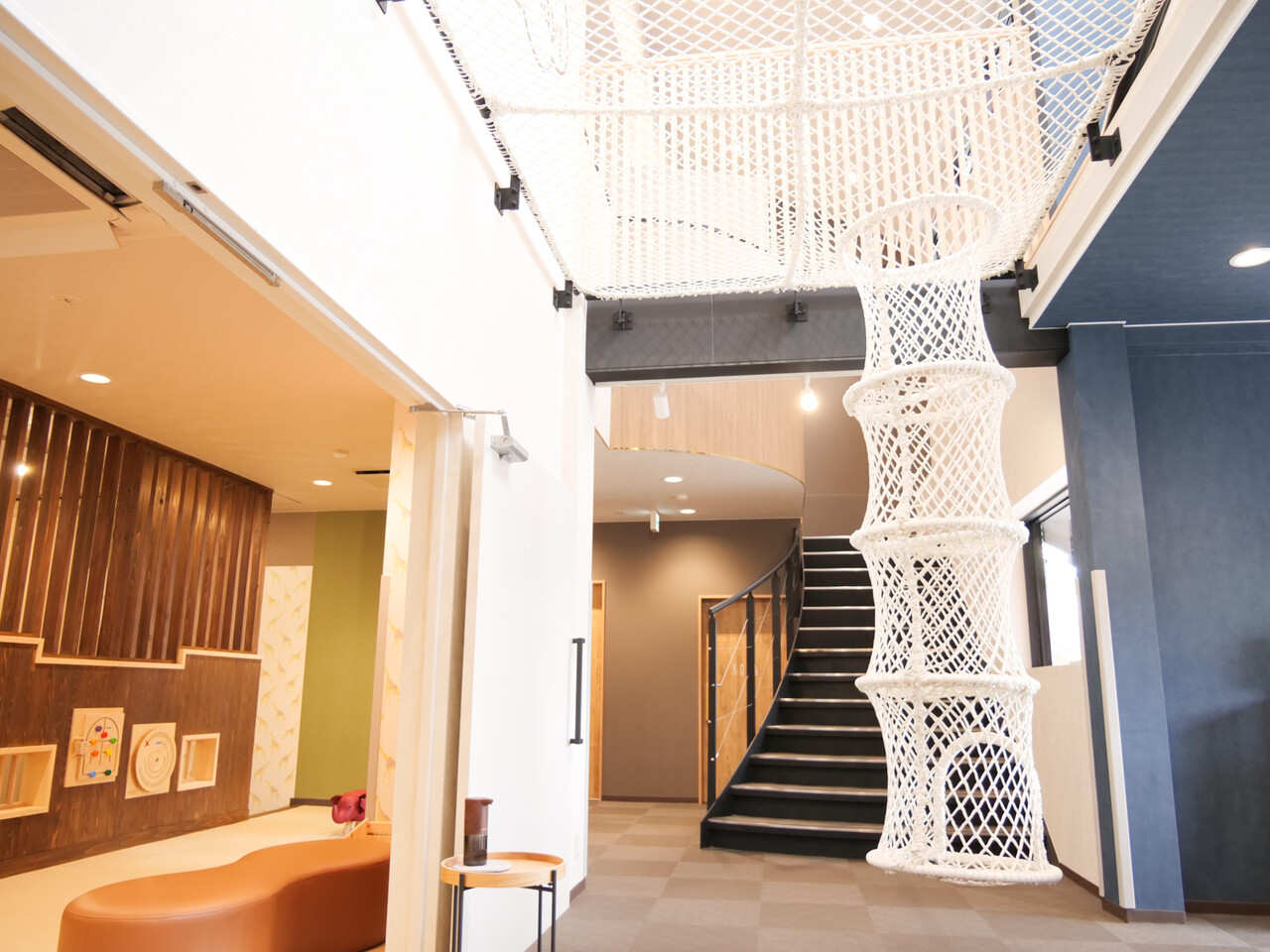 施設内に入ると目につくのが、2階から3階にかけて吹き抜け状になっているクライミングネットだ。筒状になっているネットを登って上階に行くこともでき、室内でも存分に運動ができる。