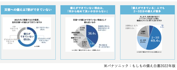 しかし実際には約7割(69.6%)の人が「備えができていない」と回答。その理由としては「具体的に何を始めればよいかわからない」36.4%、「特に始めるきっかけがない」7.3%と、「何を」「いつ」備え始めたら良いのかわからない人が4割以上に上った。一方「備えができている」と回答した人でも2〜3日分の備えが最多。1週間分以上の備えができている人は僅かで、災害への備えは十分とは言えない結果であった。