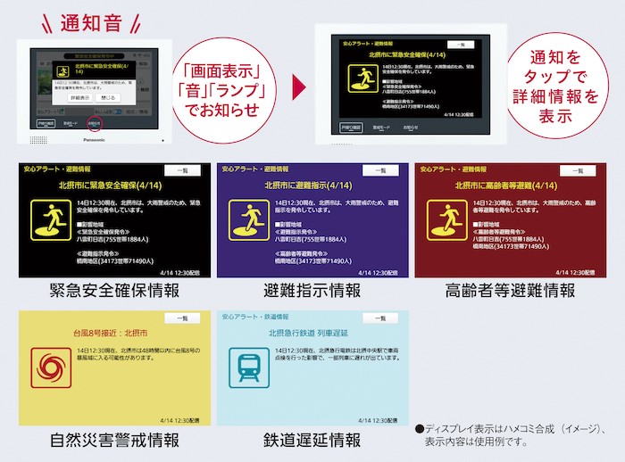 リアルタイム通知する内容には「緊急安全確保情報」「避難指示情報」「高齢者等避難情報」「自然災害警戒情報」「鉄道遅延情報」の5種。ドアホンのモニター親機から通知音とお知らせランプ、ポップアップ表示によって通知されるので、モニター親機をリビングに設置すれば家族全員で共有することができる。設定により、離れて暮らす家族のスマートフォンにアラート通知をメールで送信することも可能だ。