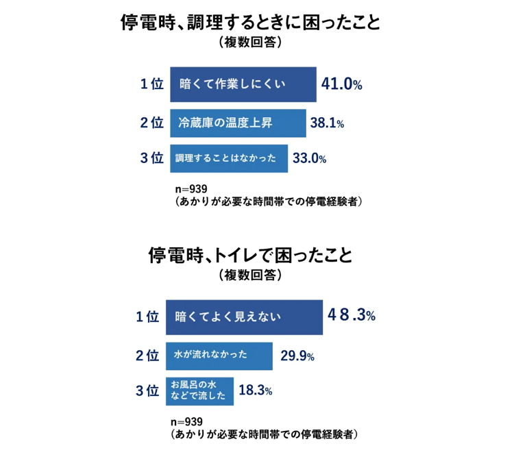 「あかり」の備えの数については、停電経験の有無で明白な差が見られた。「ランタンやあかりは家族の人数分揃っていないと、洗面やトイレで不便と気づいた(50代女性)」という声もあり、停電経験から買い足している人もいた。また停電時、調理する時に困ったことの1位は「暗くて作業しにくい」で41.0%。停電時にトイレで困ったことの1位も「暗くてよく見えない」が約半数(48.5%)となった。