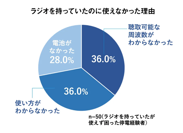 停電時の情報入手に役立つラジオ。しかし「聴取可能な周波数がわからなかった」「使い方がわからなかった」「電池がなかった」と、日常の準備不足で使えなかったという声も目立った。