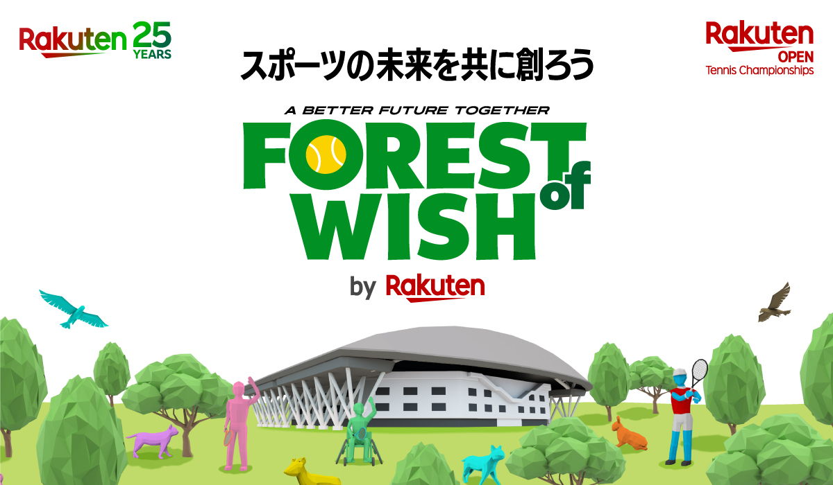具体的な取り組みとして、参加型3Dアニメーションコンテンツ「FOREST of WISH by Rakuten」をオンライン上で公開。本コンテンツは、有明テニスの森をイメージした3Dアニメーション空間の中で「選手への応援」や「よりよい未来やスポーツに対する想い」などのメッセージを送ることで、緑と生命に満ちた世界を作る取り組み。体験者自身が自分の思いを投稿することで、未来のことを考えるきっかけ作りを目指す。
