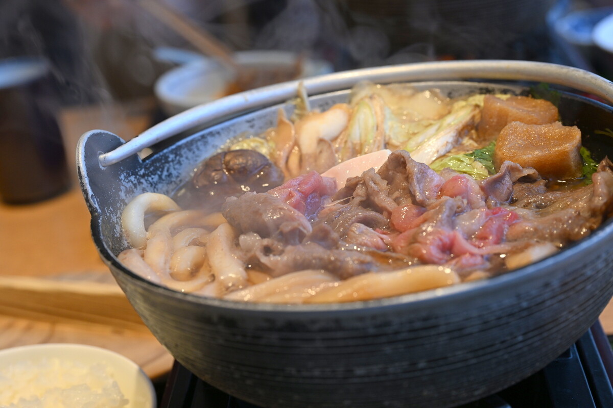 『中の坊 瑞苑』併設の和食レストラン「旬彩 猪名野」で提供されている、神戸牛すき鍋膳(昼3520円)は、鍋で肉や野菜などを自分で煮込んで食べるスタイル。