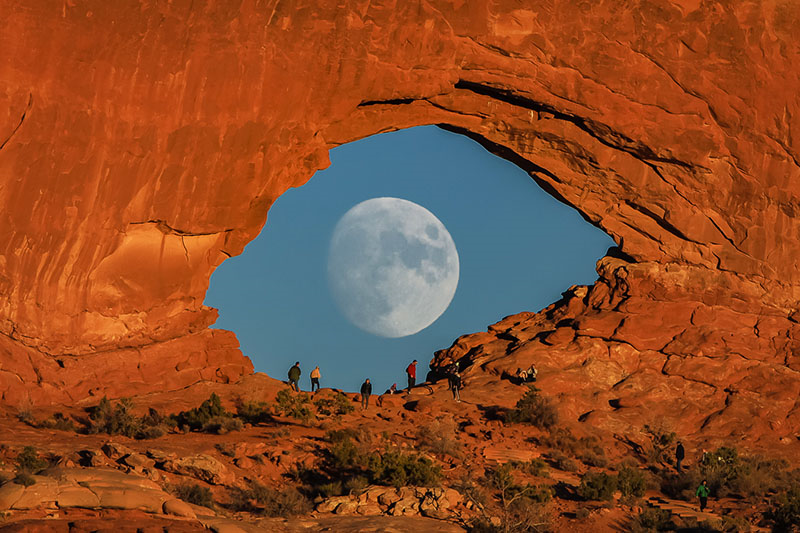 2020年10月末、アメリカ・ユタ州のアーチーズ国立公園で撮影されたこの写真、特殊なカメラトリックもPhotoshop加工も使っていないというから驚きである。大きな穴の開いたアーチ岩に満月が重なり、まるで巨人の目がこちらをじっと見ているような神秘的な光景に多くの注目が集まった。アメリカの自然写真家Zach Cooleyさんが、巨大岩のアーチ部分に満月が重なる期間を狙ってハロウィン休暇を取り、この奇跡的な瞬間の撮影に成功した。満月がアーチの中を通過するのに約5分、この中で約20秒間だけアーチの中央に配置される。この完璧な瞬間を狙うため事前に計画を練り、現地で2泊しながら撮影のベストポジションを探したという。