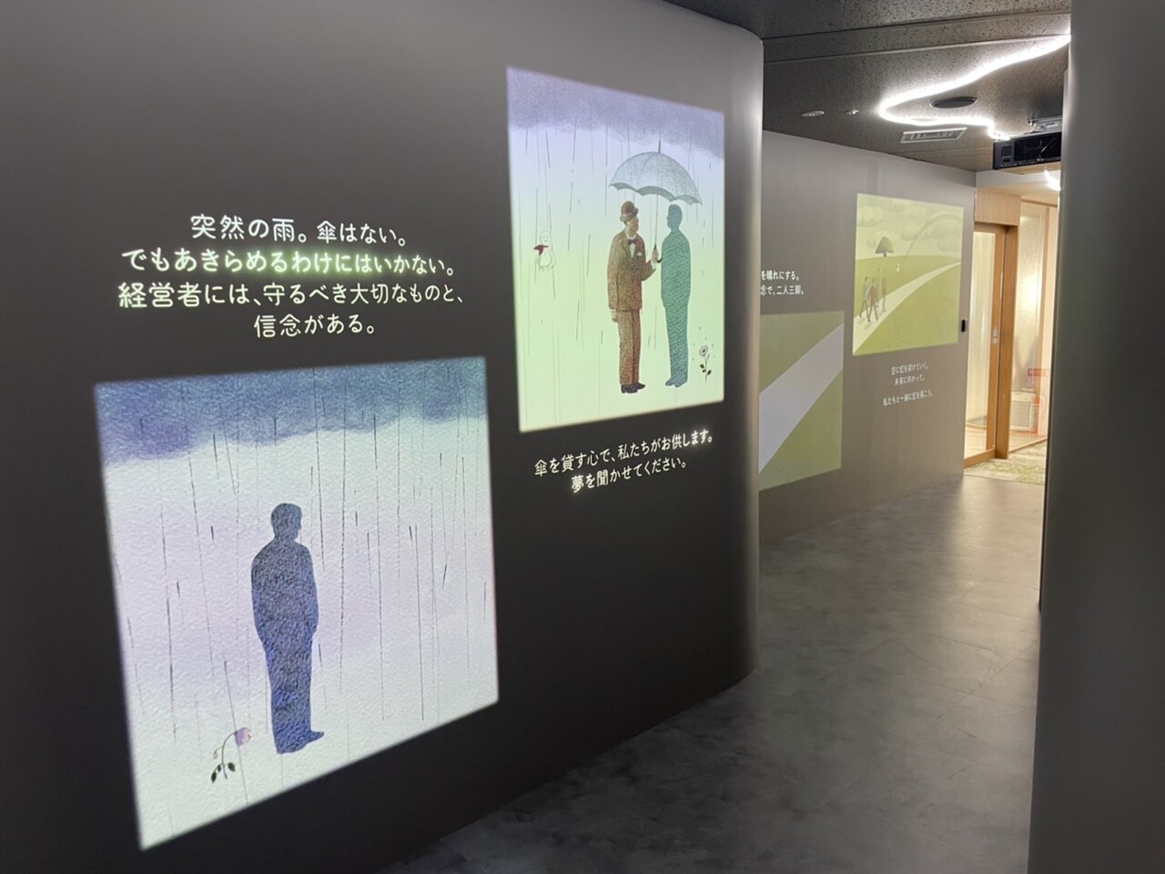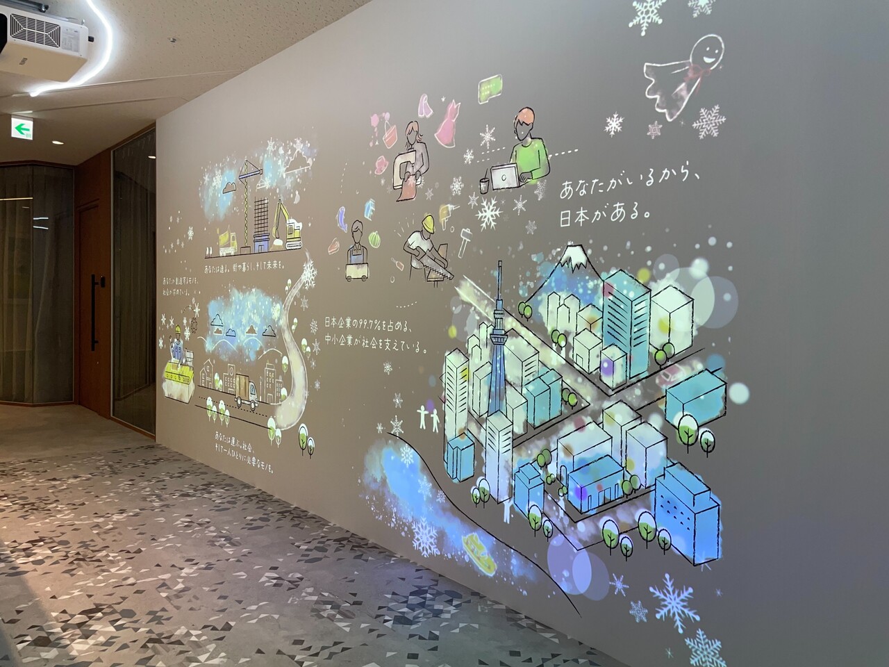 オフィスはプロジェクションマッピングを見ながら回遊するような作りとなっており、壁にはイラストともに「希望、リスペクト、傘備(さんび)、意志、未来」をテーマに理念を伝えるアニメーションが映し出されます。