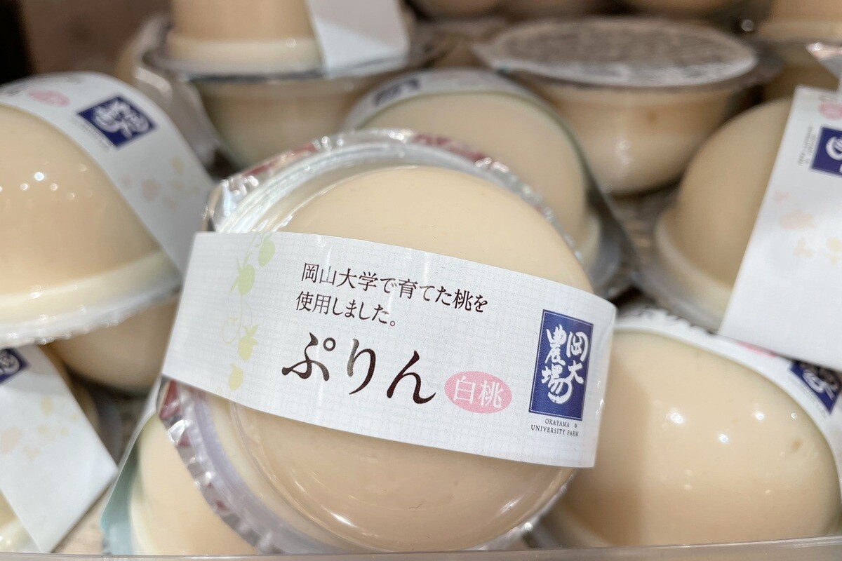 岡山県産の白桃が年中味わえる商品が「岡大農場 ぷりん」(白桃)である。岡山大学と産学連携で誕生したというブランドで、岡山大学農学部で作られた桃を使っている。