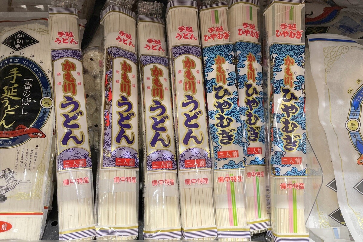 うどん以外に、ひやむぎ、そうめんなどもある。常温かつ棒状なので、持ち帰りやすい。