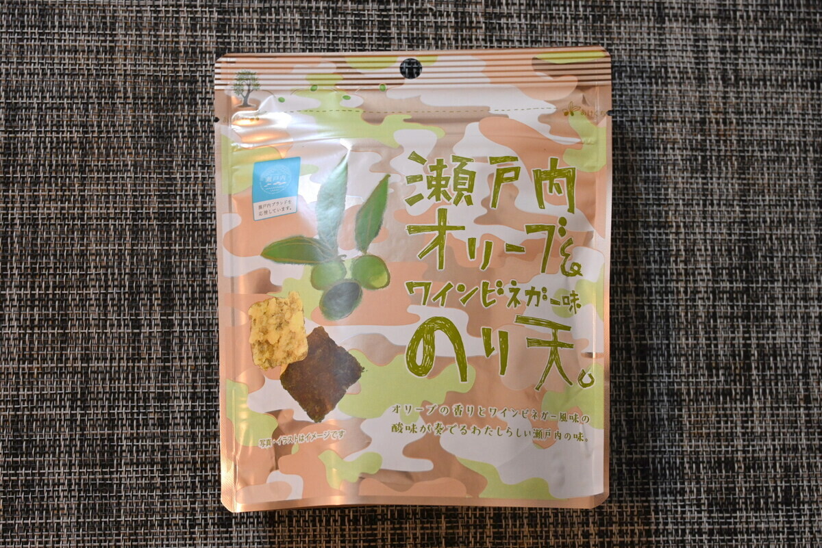 広島や岡山など瀬戸内エリアのお土産として、「イカ天瀬戸内れもん味」が有名だが、実はほかの味もある。例えば「のり天瀬戸内オリーブ&ワインビネガー味」は、食べた瞬間にオリーブの香り、ワインビネガーのさわやかな後味が楽しめる。