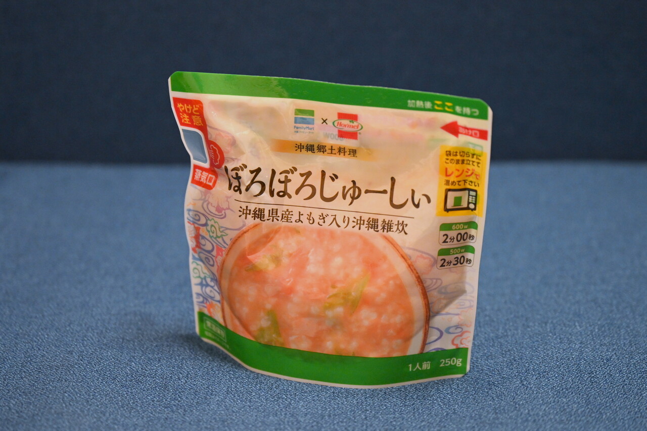 沖縄限定で、日持ちする常温商品もある。ファミリーマートで見つけたのは、沖縄県産よもぎが入った雑炊。沖縄では雑炊のことを「ぼろぼろじゅーしぃ」と呼ぶ。これも電子レンジでチンとするだけで、沖縄の郷土料理が味わえる。