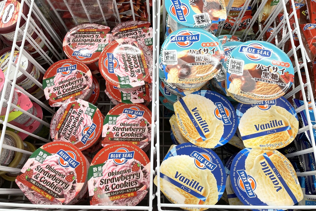 そして、アイスクリームのコーナー。沖縄のアイスクリームといえば「ブルーシール」であり、コンビニで手に入ることも。1カップ150円ほどで決して高くなく、おやつや夜食にちょうどいい。「ハイサイ黒糖」などは、いかにも沖縄らしい味。