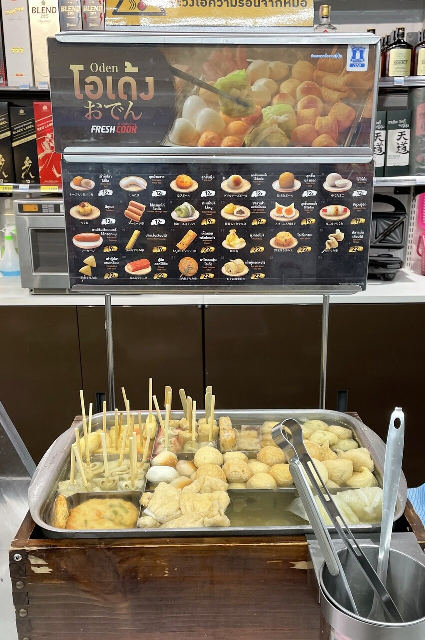 常夏の国タイで温かいおでんを食べる人がいるのだろうかと思ったら、目の前でタイ人の若い女の子たちが買って行った。おでんの具は日本とほぼ変わらず。ちなみに、コンビニのおでんは台湾でも現地の人々に人気が高い。