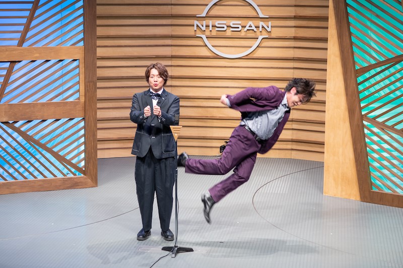 アリアのシート足元の広さやスムーズな加速力、日産のボイスアシスタント機能やプロパイロット機能などに絡めたネタが次々に披露。コミカルな世界観で表現され、床にダイブするという松陰寺さんの体を張った演技には、会場から爆笑の渦が巻き起こった。