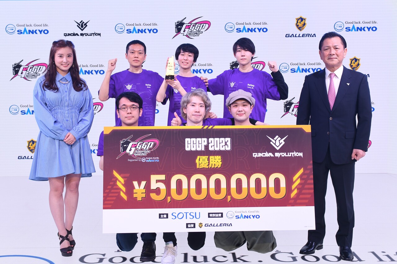特別協賛の株式会社SANKYO 代表取締役副社長執行役員 富山一郎氏からトロフィーを手渡された Rafale のNATYRAY 選手は「「 GUNDAM EVOLUTION 」を始めて、プレイしていく内にチームメイトのようなフレンドが増えていって、このような晴れ舞台でライバルたちとも知り合えて、本当に嬉しいです。応援ありがとうございました」と感謝の気持ちを述べた。リーダーの kazukuri 選手は「 チームメイトに向かって みんなありがとう、お前らを呼んで本当に良かった、最高だった」と語り、チームの縁に関して感無量に語った。エンディングではキャスターの田口尚平氏は「本気と本気がぶつかると、巻き込む全ての人の魂が震えるなとオフライン大会の良さを感じました。優勝した Rafale に関しては、短期間でこんなにも人と人との関係が固くなり、個々人が進化していくというゲームというよりも人生の一面を覗かせてもらった良い大会だったと思う」と語り、GGGP2023 スペシャルサポーターの時田愛梨氏は「11月から始まった本大会ですが、私も観てくださっている皆様と一緒に楽しんで応援出来たと思います。また、ゲームを通じてこんなにも熱くなれるものなんだなという経験をさせて頂いて、選手の皆様含め運営の方々には感謝しております。参加させて頂いてありがとうございました」と激戦のフィナーレを振り返り、4ヶ月続いた熱戦はここに幕を閉じました。