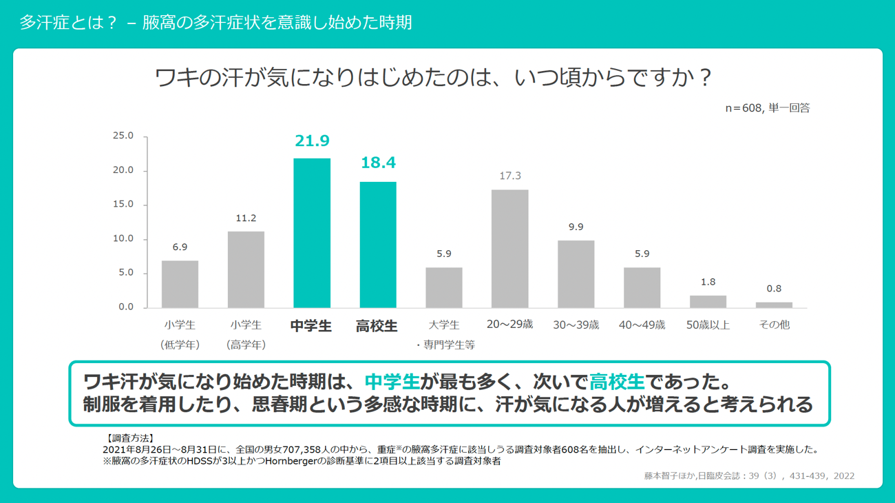 藤本先生によると、ワキ汗(多汗症)が原因で学校行事に参加できないという中高生は少なくないが、医療機関への受診率は未だに低いとのこと。