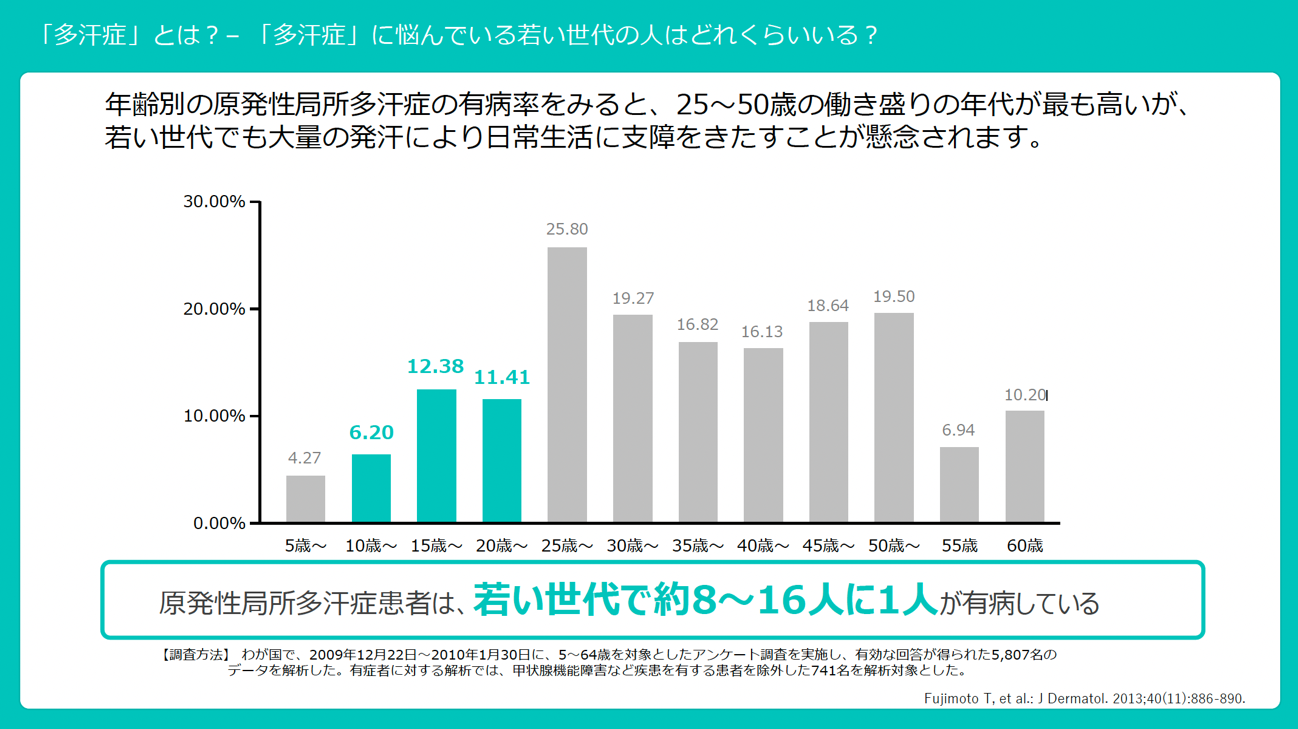 年齢別の原発性局所多汗症の有病率をみると、25〜50歳の働き盛りの年代が最も高いが、若い世代においても有病率は高く、8人から16人に1人の割合とされる。