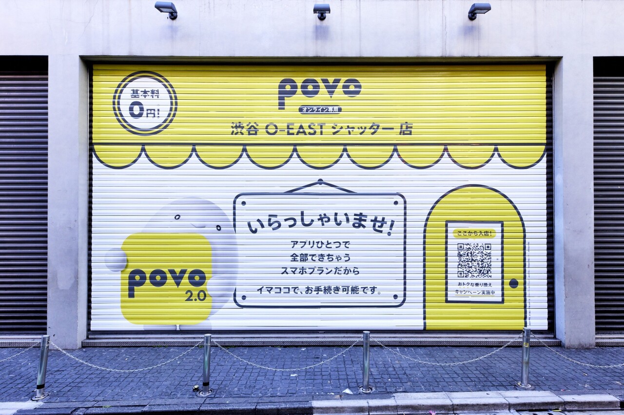 「povo2.0」はオンライン専用ブランドのため、キャリア乗り換えやプラン変更など、手続きがアプリひとつで手軽に完結します。今回のMNPワンストップ対応に伴い、「povo2.0」はオンライン専用ということを逆手にとり、専用のQRコードが掲出された壁面が「povoショップ」となった、ちょっとしたスキマ時間でお手続きができてしまう期間限定の新しい取り組みを開始。