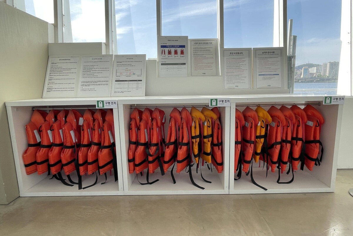 建物の隅に、救命胴衣があった。やはりここは船。客の数からすると全然足らないのだが、備えておかないといけないのだろう。