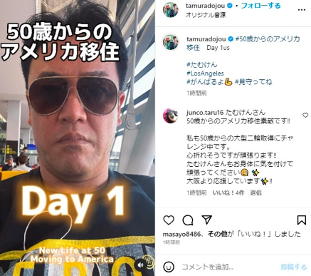 たむらさんは2021年12月放送のテレビ番組内で、50歳の誕生日を迎える2023年5月4日に芸人を引退し、実業家として渡米することを発表し実現させたのです!有言実行(有吉弘行みたいですね)実に頼もしい!!