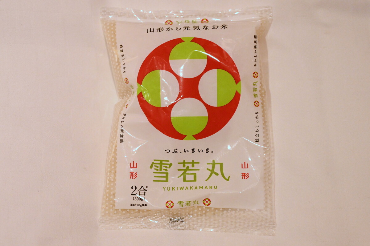 つや姫のほうが高級ブランド米、一方、雪若丸は料理の美味しさを引き出す、料理との相性抜群という特徴を持つ。米は持ち帰るのが大変だが、「2合」サイズならお試しにもいい。