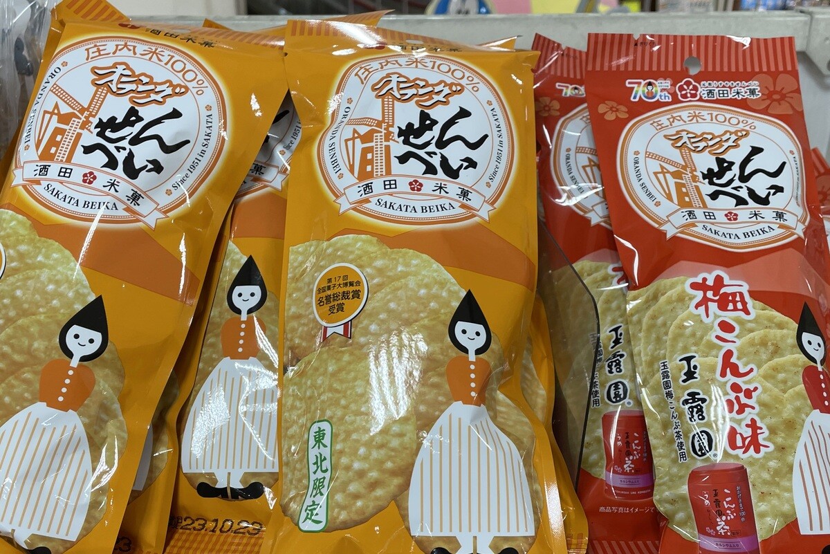 なぜ山形でオランダかというと、海外のオランダ(国)ではなく、製造元の酒田米菓によると「私達(おらだ)が丹精込めて作った庄内米を使い、私達(おらだ)の手によって作られた、私達(おらだ)のおせんべい」とのこと。