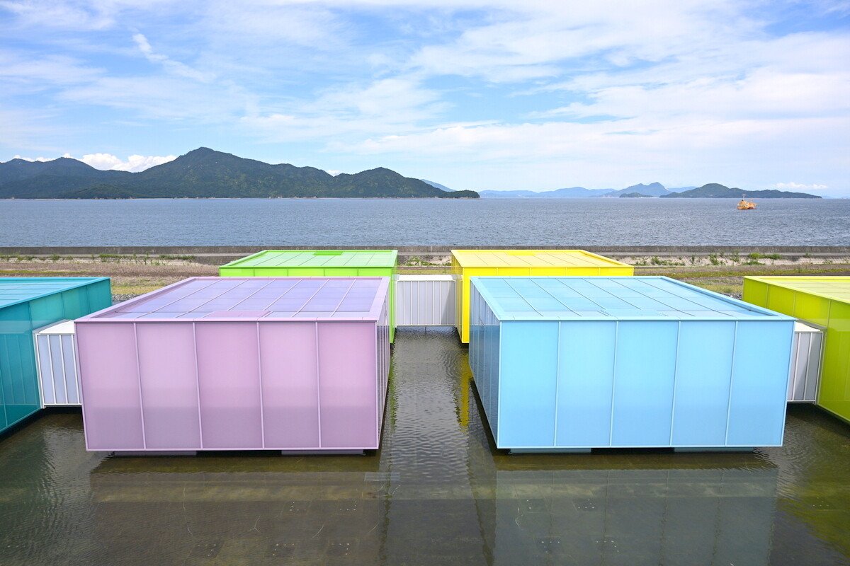 また、水盤の上に浮かぶ8棟のカラフルな可動展示室は、坂茂氏が瀬戸内海の島々からインスピレーションを得たもの。水盤の水位が増すと浮力で浮いて動かせる仕組みで、これそのものが、世界的にも珍しい建築作品です。