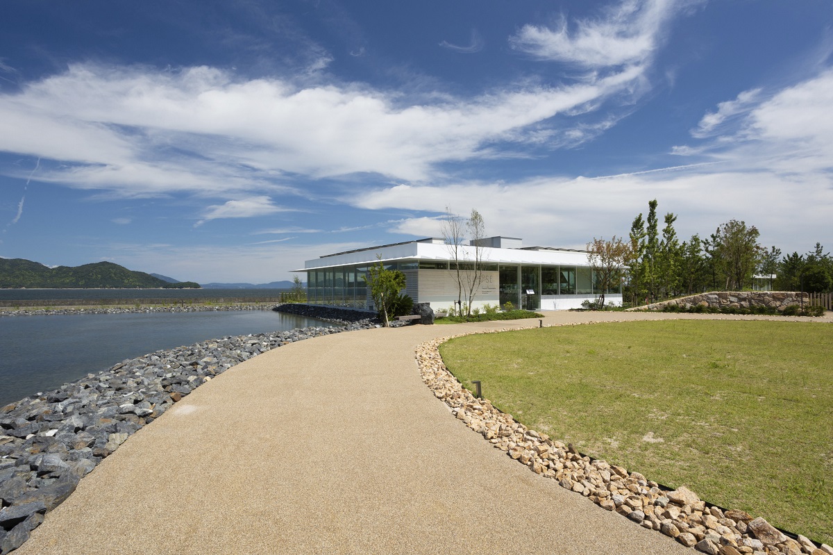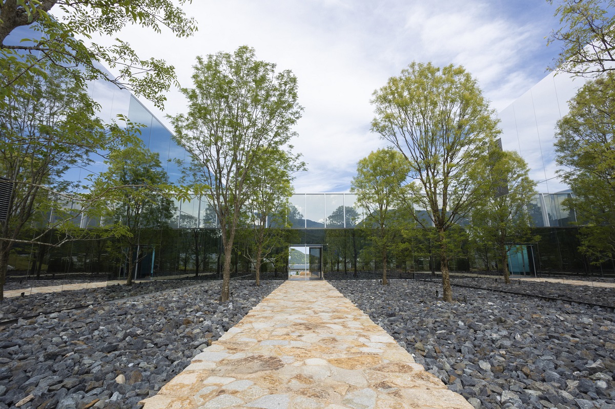 美術館のデザインは、東京・パリ・ニューヨークに設計事務所を持ち、国際的に活躍する建築家の坂茂氏。各棟を渡り廊下でつなぎ、ミラーガラス・スクリーンで一体化されています。周りの景色がそのスクリーンに映り込むことで、瀬戸内の自然、そして現代建築がまるで融合したかのような見事な空間となっています。
